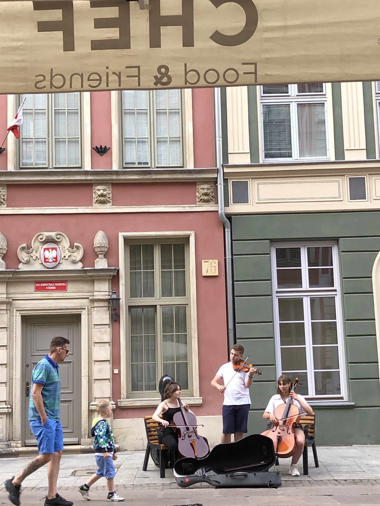 Dinner was a relaxed affair on the terrace of Chef on Dluga Street, the main tourist street in old town Gdansk. We enjoyed good food and people watching while being serenaded by some street musicians nearby. This street which leads down past the Neptune fountain to the water has beautiful buildings with many interesting doorways and sculptures.