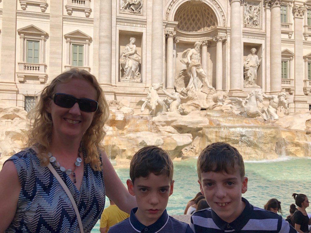 Next stop was the Trevi Fountain. Again it was busy and bustling. The fountain marks the terminal point of one of the aqueducts that supplied water to Ancient Rome. We managed to get some photos and the boys threw the obligatory coin over their shoulder into the fountain. There are an estimated €3000 thrown into the fountain each day! The security guard on duty is kept busy 😜