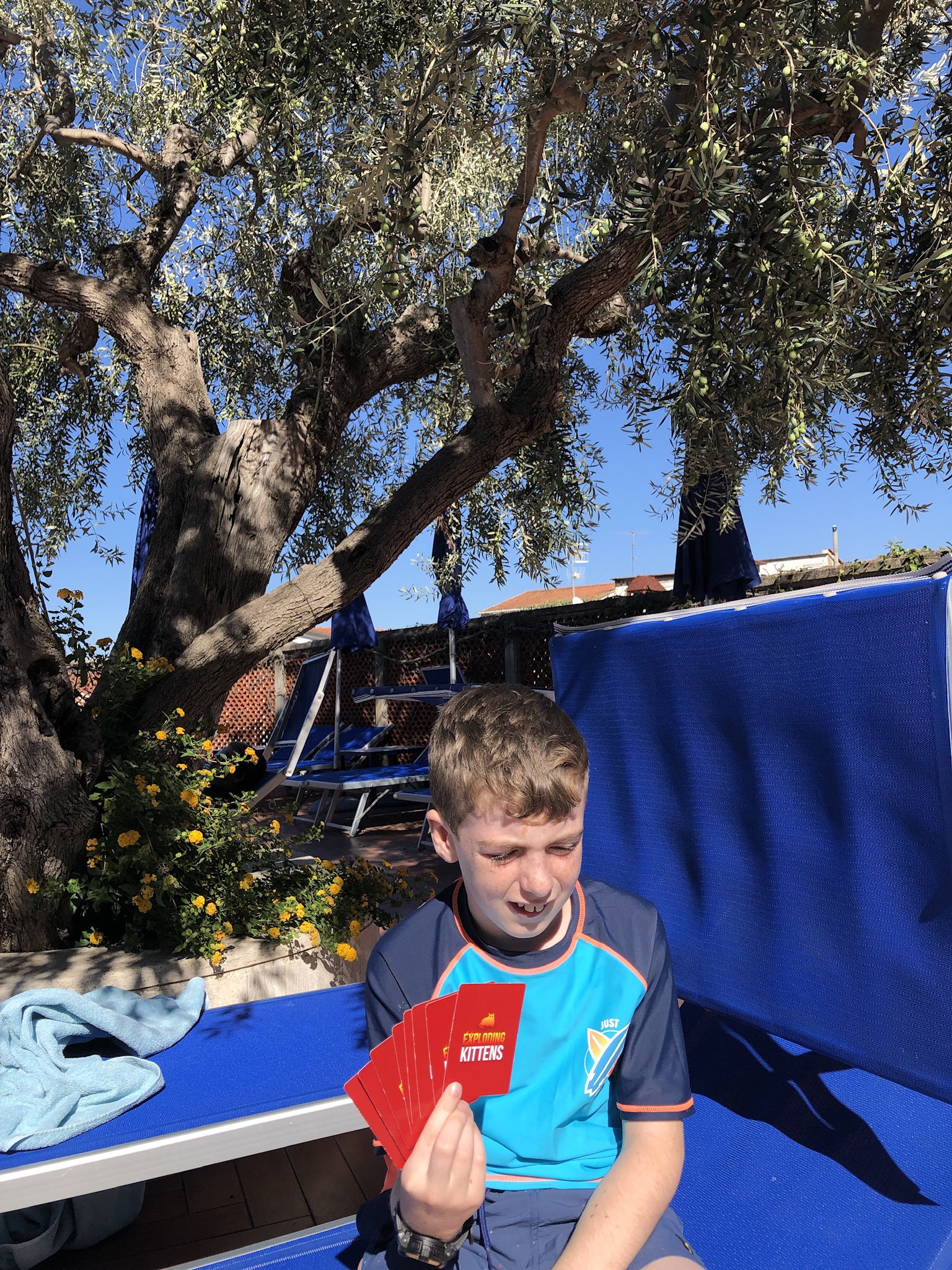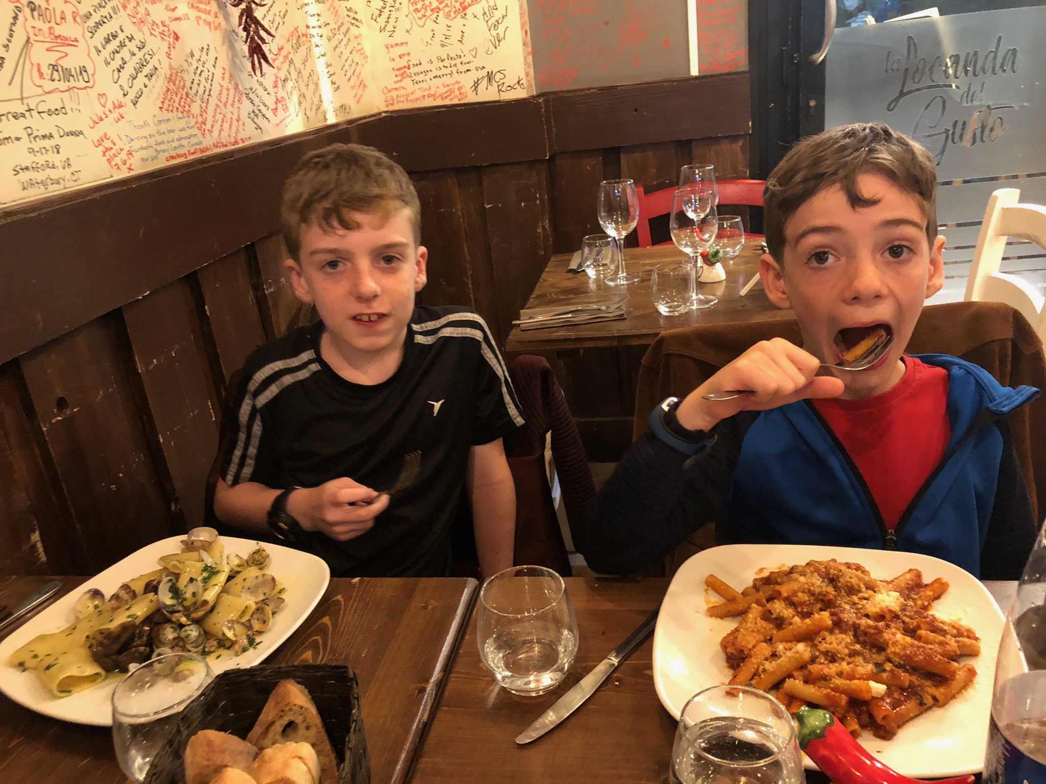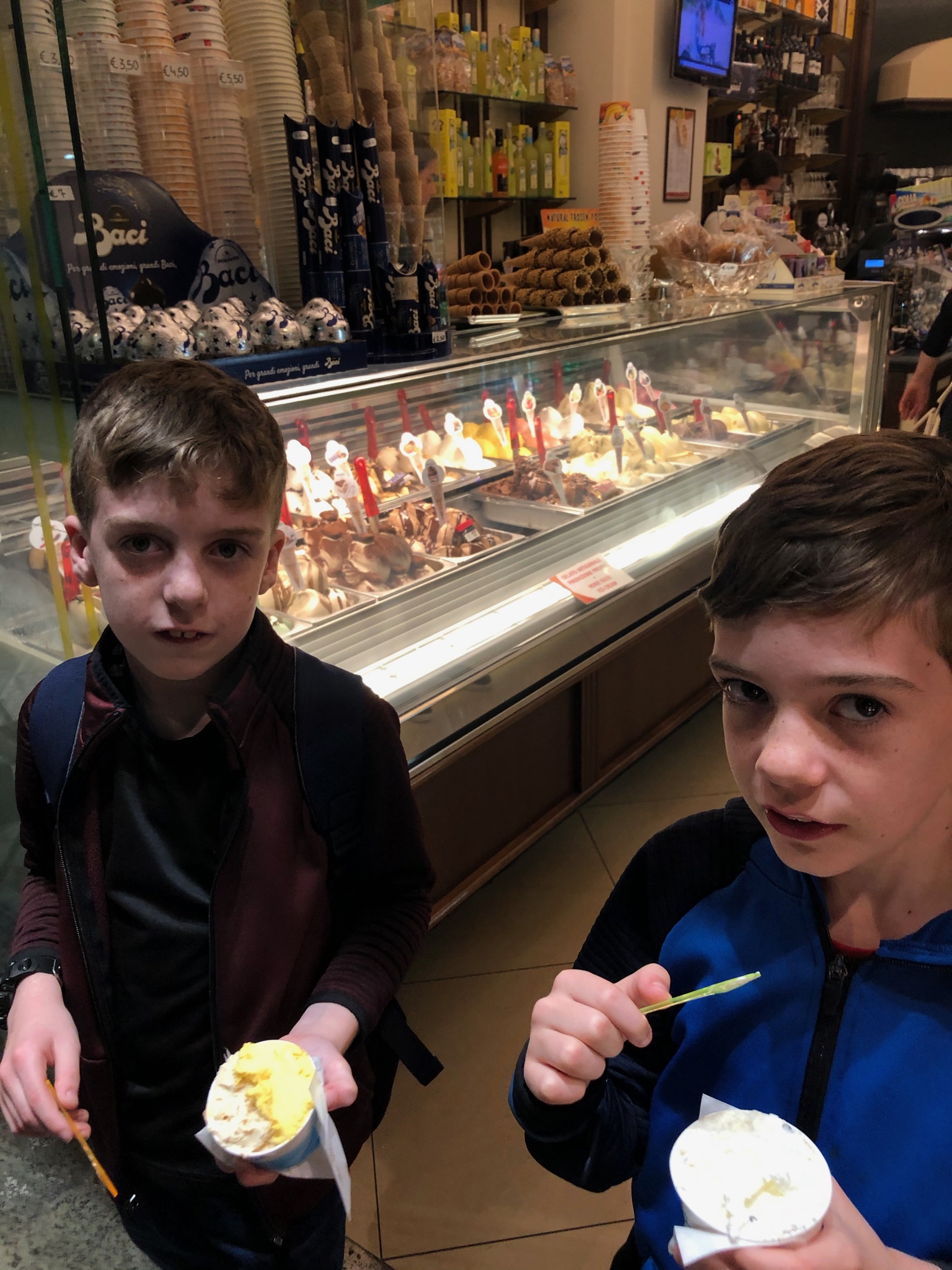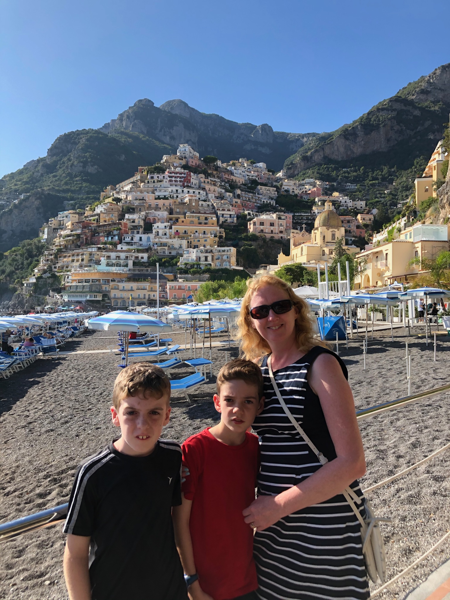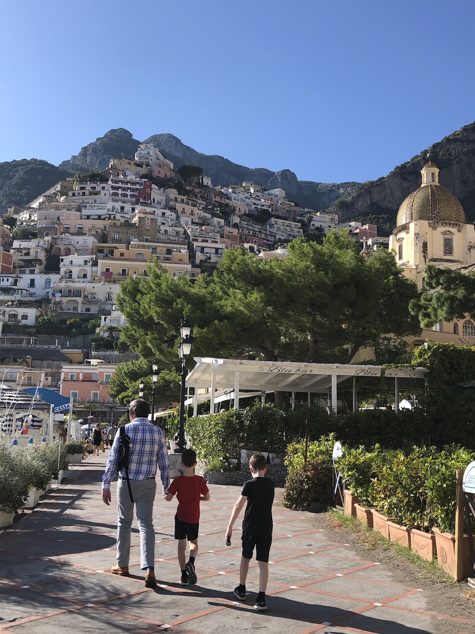We got tickets for the ferry back to Sorrento at the port. Then we bought our postcards. The boys have one from everyplace they’ve ever visited- quite a large collection. We sat on the pier and watched all the antics on the water while the boys tried a Positano gelato. Then we caught the ferry back, cheaper than the taxi and it came with superb views of Capri and an amazing sunset too.