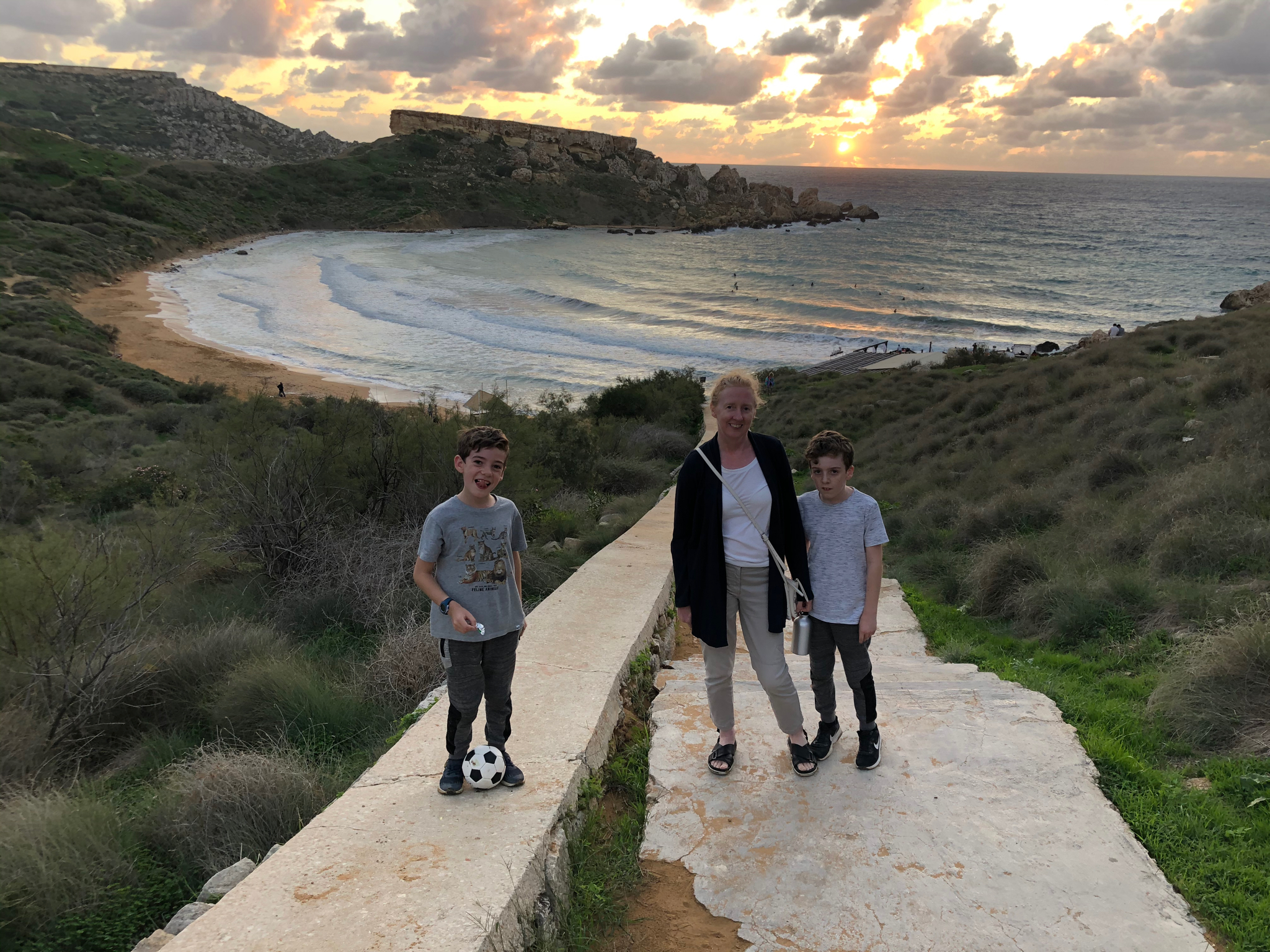 First stop in Malta was Park Lane Hotel in St Pauls Bay for five nights. We were initially very surprised by the number of English tourists there until we learned that a large expat community lives there. There were lots of restaurants and a nice boardwalk around the headland. Our hotel had a rooftop pool with views of the bay and the many cranes adding even more apartment blocks to the concrete village. We had RTÉ, the Irish TV channel, via the hotel cable TV. A nice novelty but it didn’t feel like we were in Malta! We spend a lovely evening on the nearby Miracle Beach, Gajhn Tuffieha. There were hikers on the hillside and surfers tackling the waves. The boys outlined a football pitch and had a great time playing while we walked the beach and watched the surfers and the sunset. This beautiful area was more what we expected from Malta.