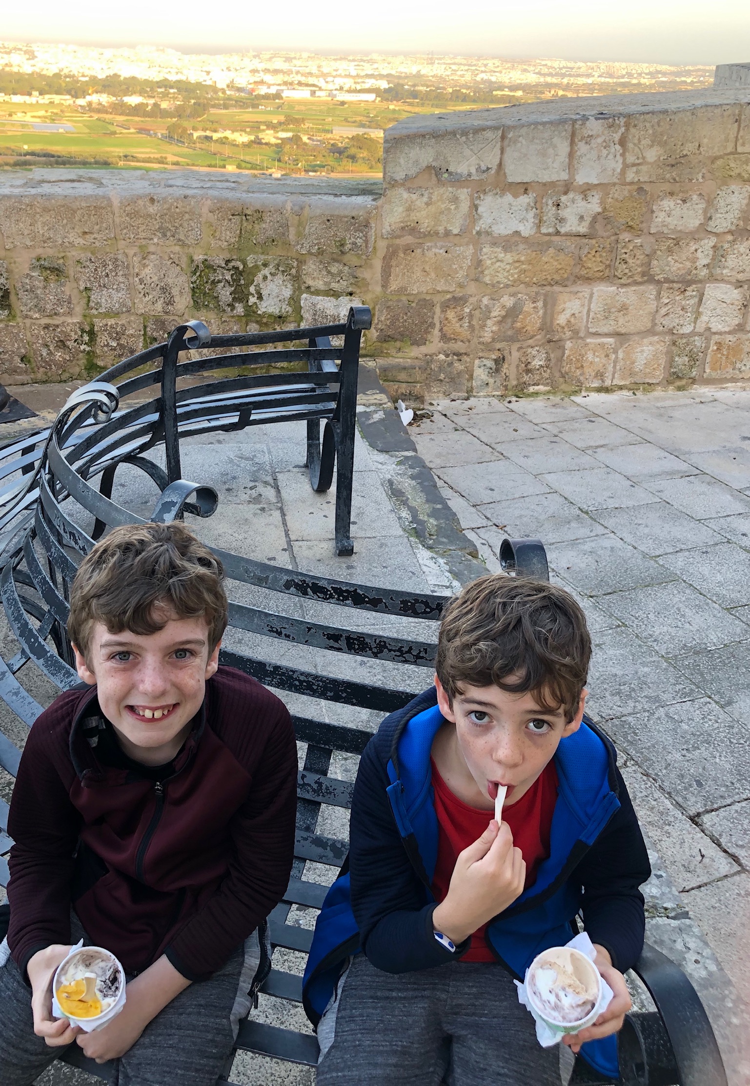 We saw more strong winds and stormy waters at Mellieha Beach. An unexpected stay but a good one nonetheless, thanks Troy! We spent two nights in Hotel Maritim Antonine. The weather wasn’t great but there was a big buffet breakfast, an indoor pool and nightly entertainment so we were fine. Two rooms for two nights for $187 a bargain, the best bargain yet! The walk down to the beach was long but downhill, coming back up was a different story. Mamó and the boys managed to catch the bus. The huge waves washing up over the sea wall were impressive. We also found one of our restaurant highlights of the trip on the way to the beach. It was called 180, we booked a table for the evening as we passed and returned that evening. The food and service were excellent and even though we were the only diners it didn’t feel strange. We drank a toast to Troy for helping us move on from his chaos and finding this lovely spot!