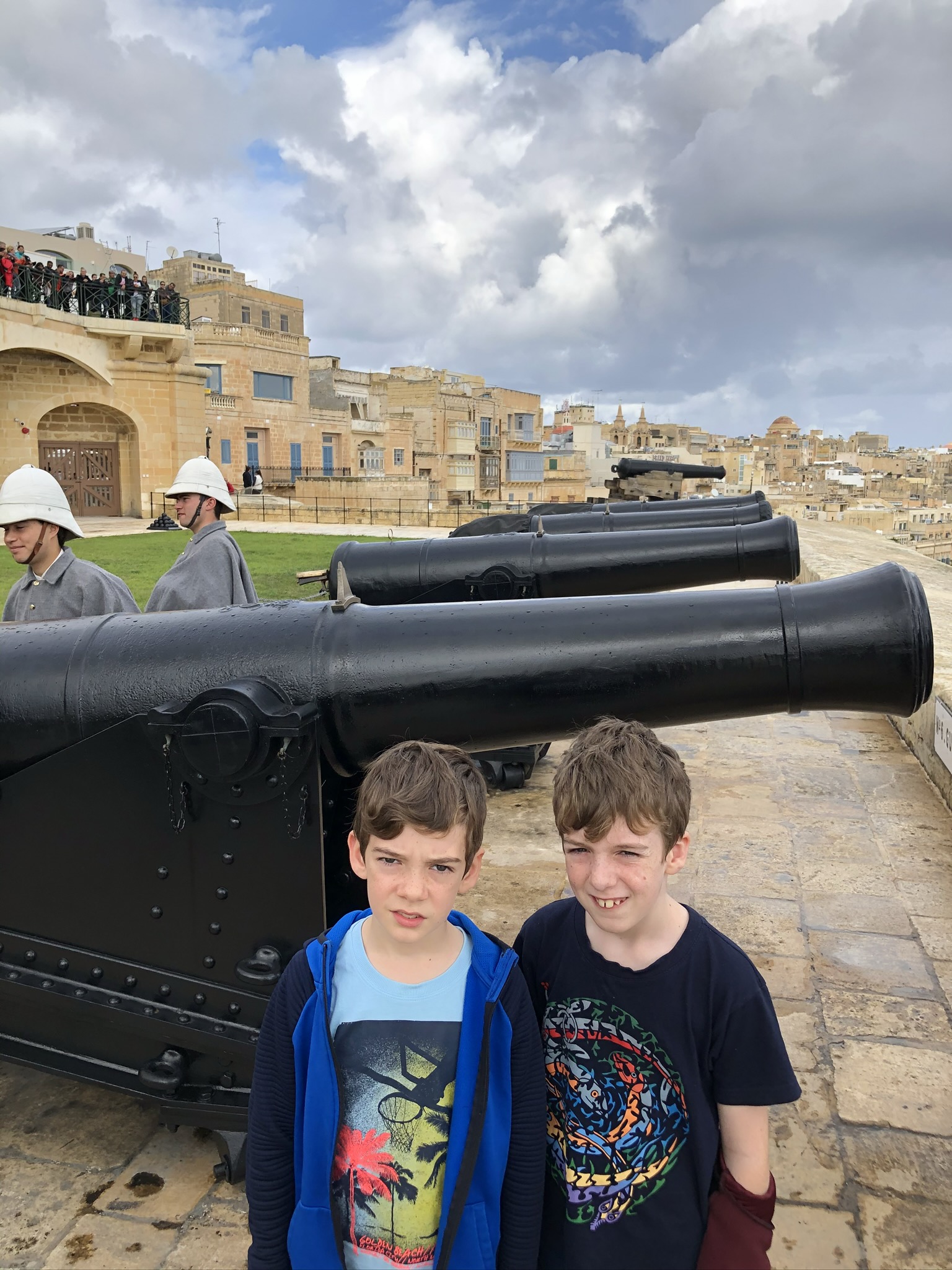 The next morning we walked through the beautiful streets admiring the architecture. The whole city is a dedicated UNESCO world heritage site and at times it feels like walking through an open air museum. We returned to the Upper Barrakka Gardens and paid a small fee to enter the Saluting Battery just before noon. Located high along Valletta’s eastern historic ramparts, it enjoys unrivaled spectacular views of the Grand Harbour and its surrounding fortified towns. It is also perhaps the oldest saluting battery still in operation anywhere in the world. For almost 500 years, its guns protected the harbour against naval assault. A guide explained the gun salute to us before we watched the cannons fire.
