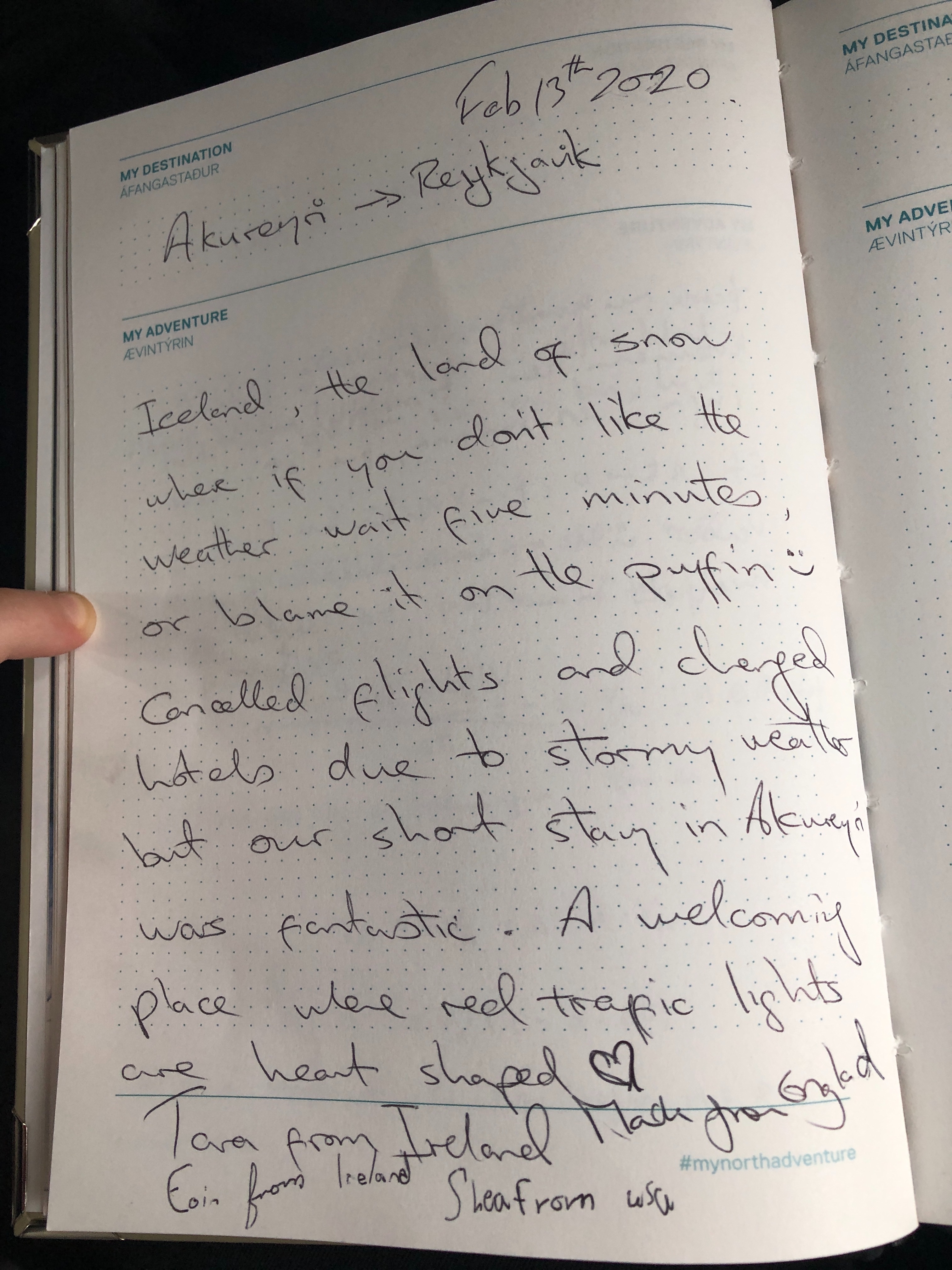 The airport was tiny and the normal rules concerning check in and security didn’t apply. Some passengers arrived 20 minutes before take off and just walked straight onto the plane. The flight to Akureyri in northern Iceland took a mere 35 minutes. The small propeller plane caused some initial panic but it was a very smooth flight with spectacular views. On-board they had some travel journals in the seat pockets for travellers to record and share their Icelandic adventures. A nice touch.