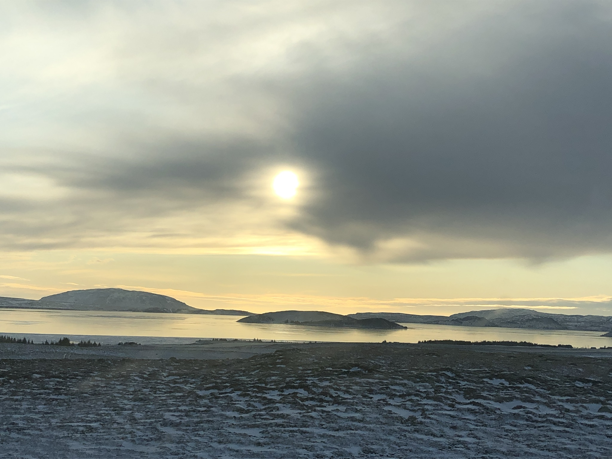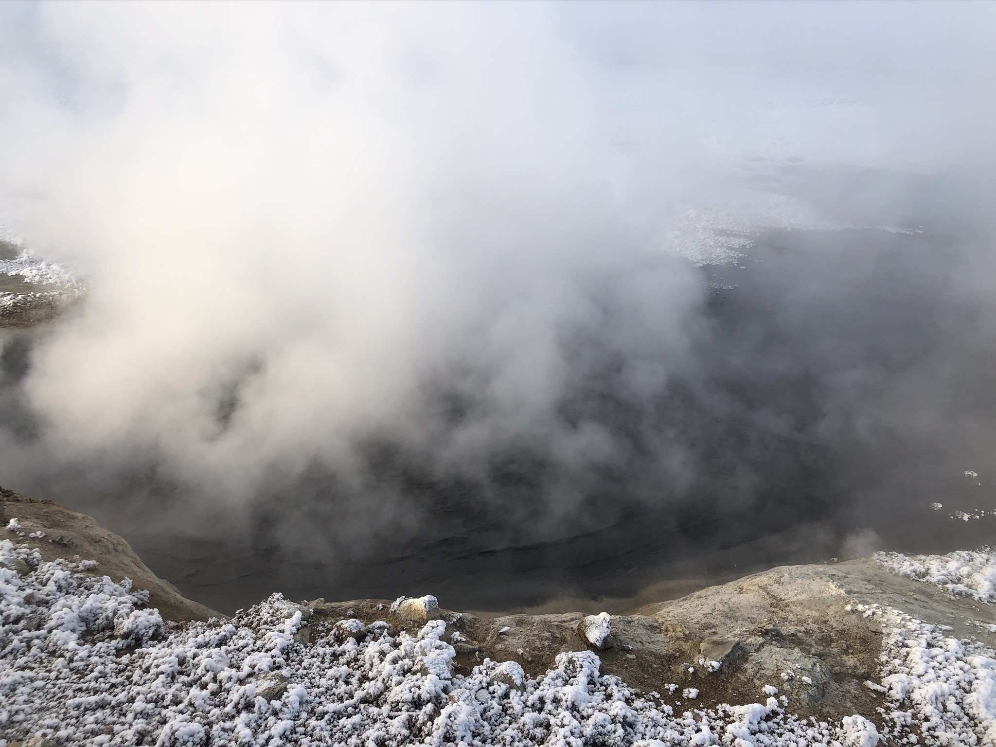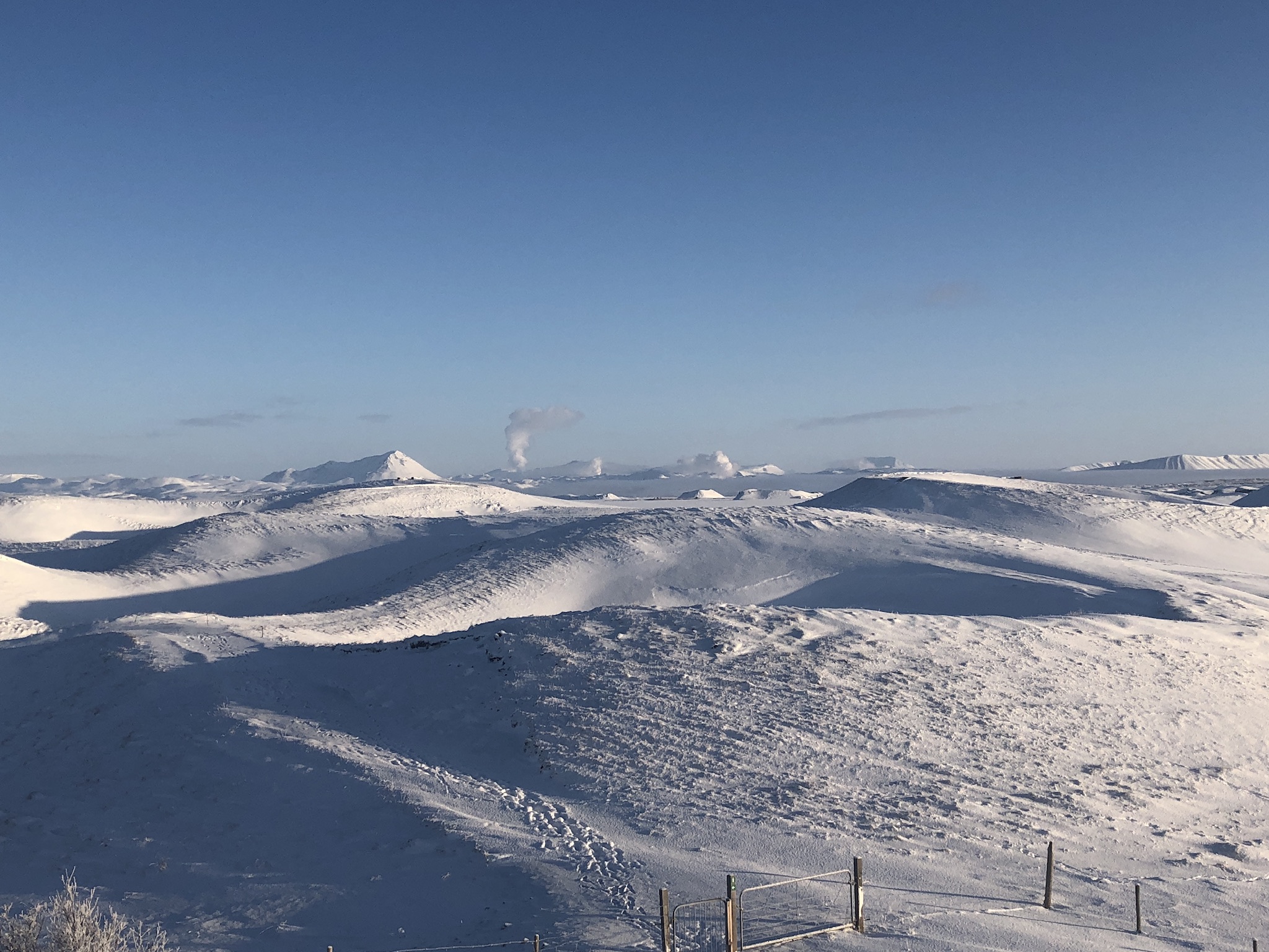 Next stop was Lake Myvatn. A very frozen looking Lake which looked like a field. It’s the fourth largest lake in Iceland and features lots of geothermal activity and volcanic features. It was surrounded by volcanic craters and geothermal gases rising into the air. There was a track across the ice where people drive and the movie ‘The Fast and the furious’ was filmed here using hundreds of imported cars which were also driven across the ice.