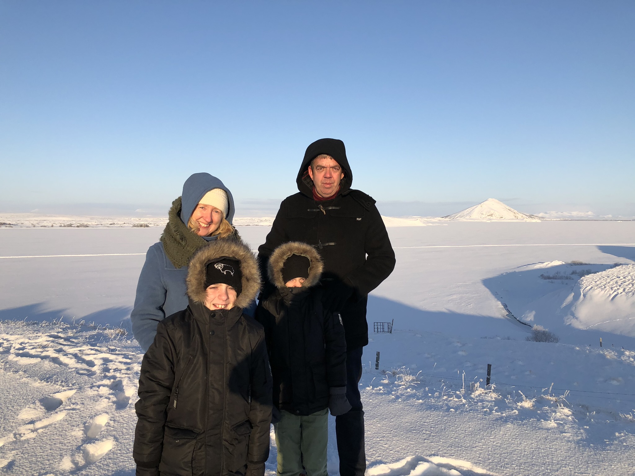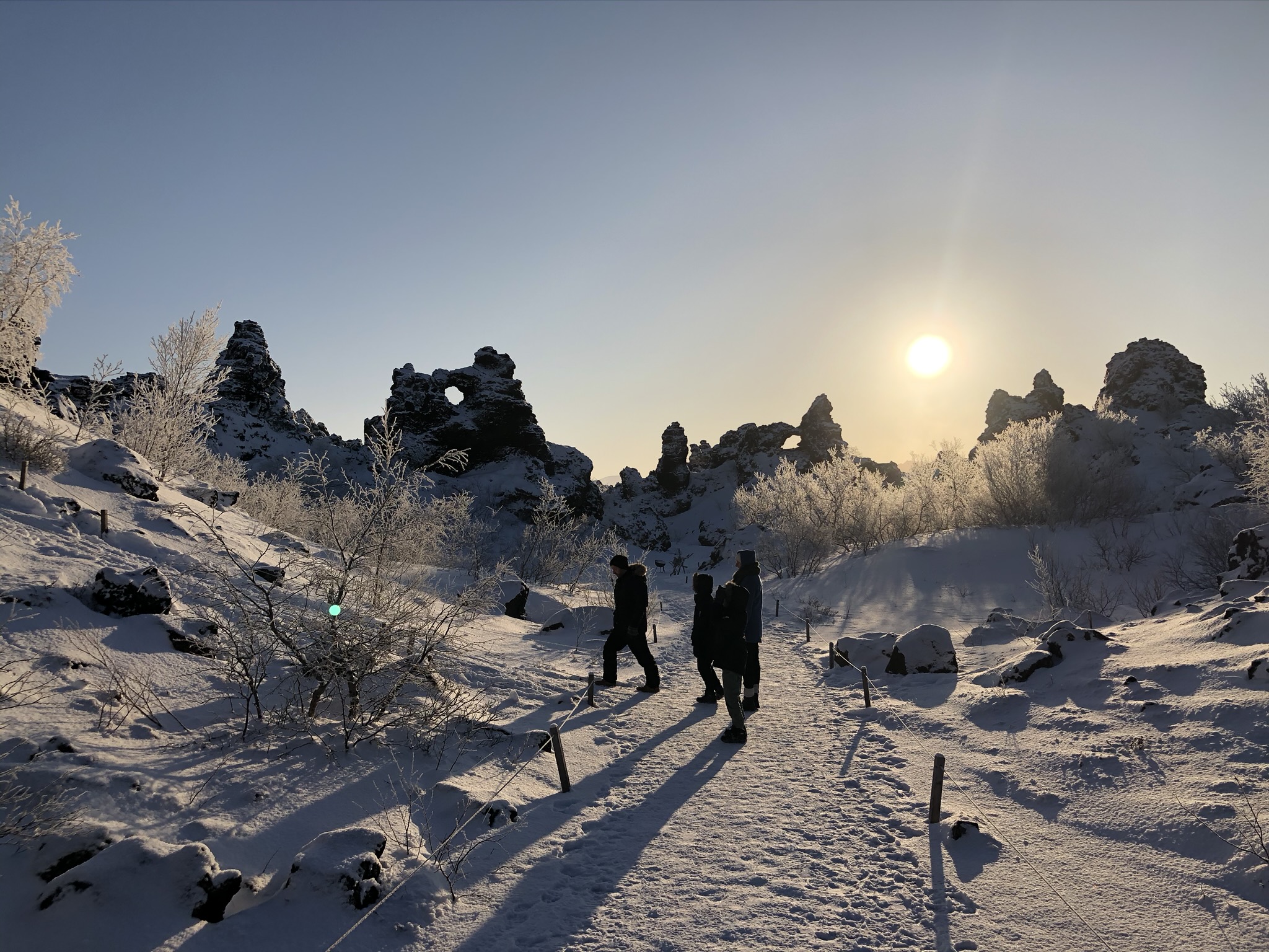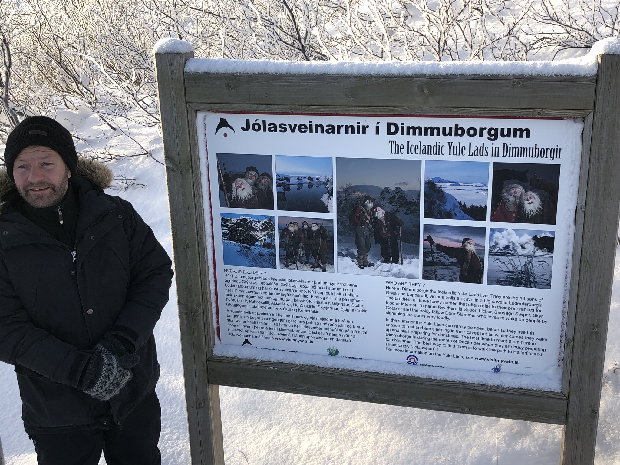 Dimmuborgir, or the Dark Fortress, is an area of dramatic lava rocks. We got the bonus of trees covered in snow and ice on our visit. One story connected with the place is that of the Icelandic Yule Lads. The 13 sons of the trolls Gryla and Leppaludi are Santa Claus figures who bring presents to the children for thirteen nights leading up to Christmas Day, the kids leave a shoe on the window ledge and in the morning find a present or a rotten potato, depending on behaviour. Families can visit them here in the cave in Dimmuborgir.
