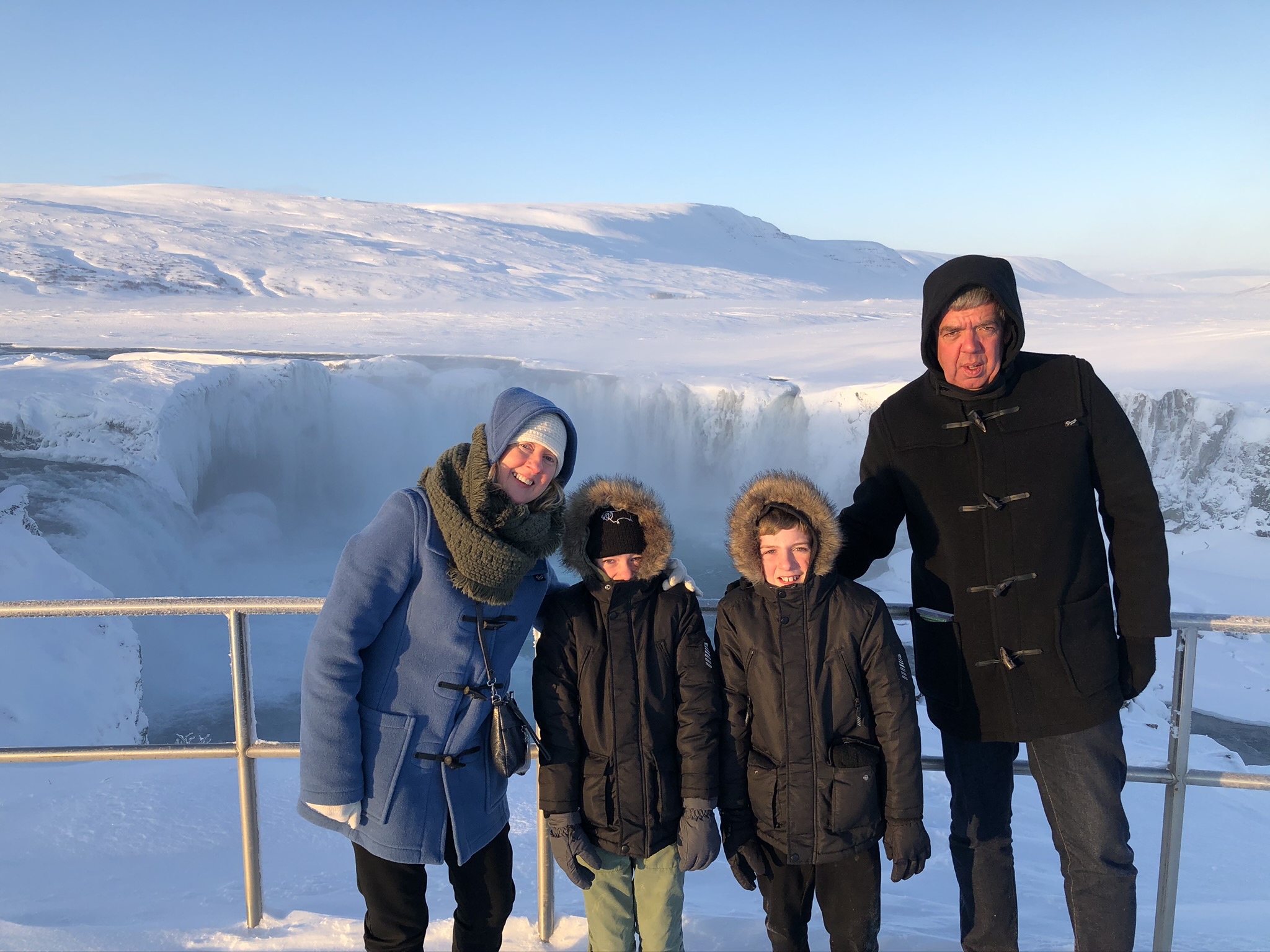 Next morning we’d had a change of plans due to a serious storm coming in on Friday. Flights were going to be cancelled and roads closed. We had to change our flights and leave early or risk missing our flight to Norway in a few days. So we started our day early and tried to see as much as we could before leaving again. We had breakfast in a local cafe called ‘Berlin’ and our tour guide Reynir collected us from there. We had an amazing tour with him from 9.30-2.30 when he dropped us back to the airport. First stop was Godafoss, Waterfall of the Gods. The temperature was low and the wind chill high, about -25, we’ve never been so cold and nearly ran back to the car.