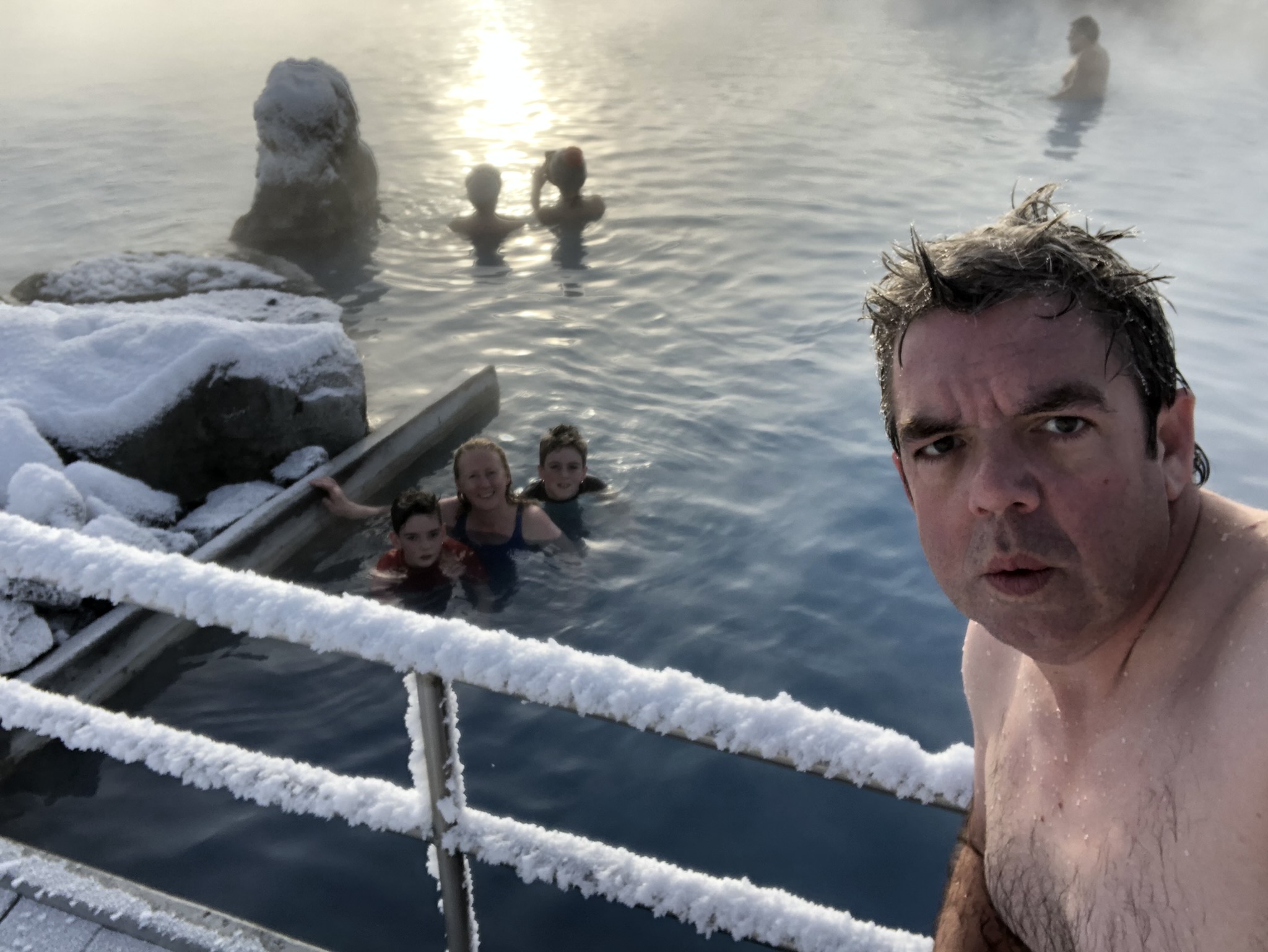 Last stop was at the Myvatn Nature Baths , time to warm up and relax after a busy morning. The challenge to run through the snow barefooted was rewarded with the warm geothermal waters of the natural pools. The poolside lava rocks covered in snow added mystique to the experience as did the hair freezing on our heads!