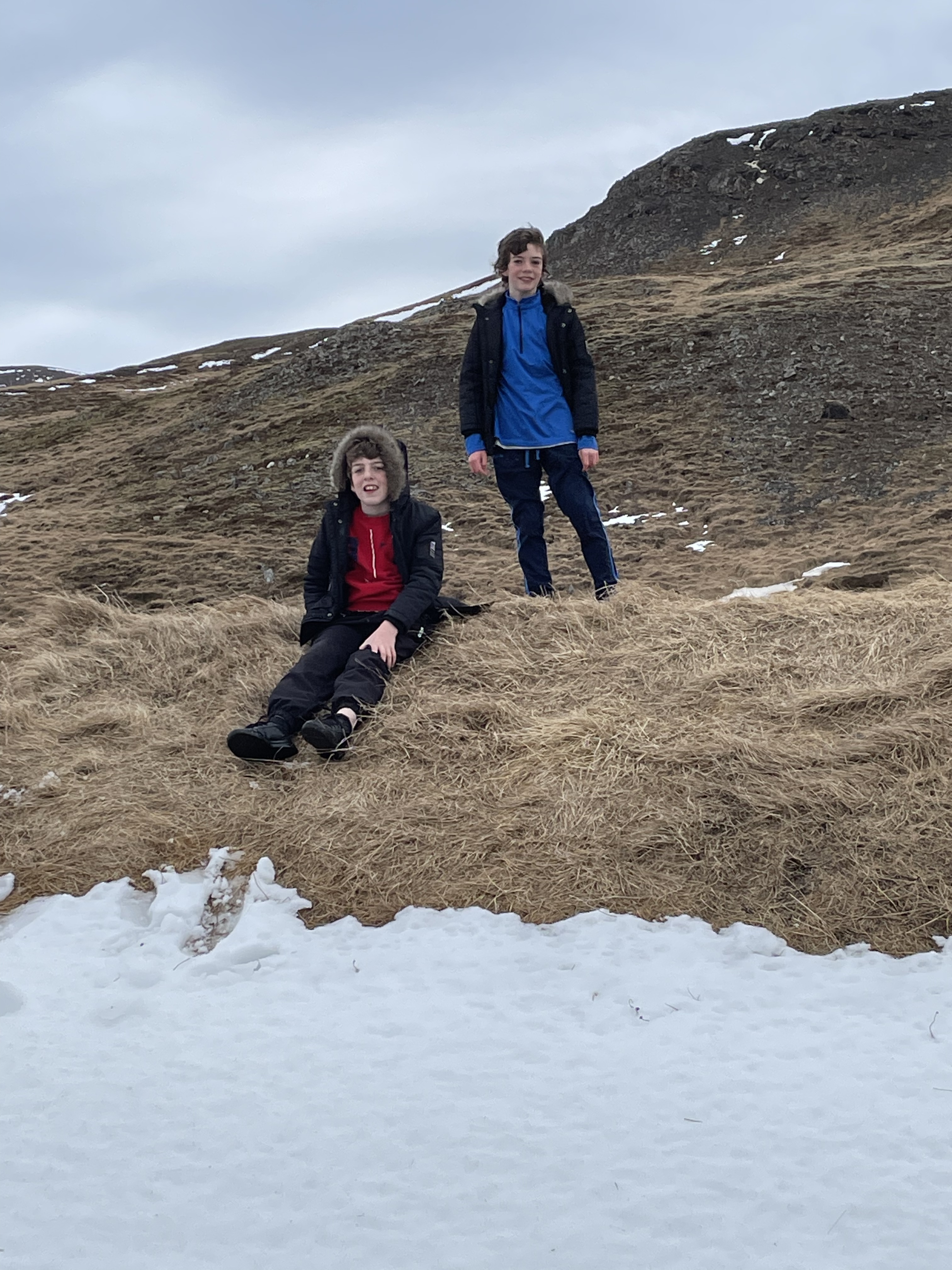 Hoping to spot some puffins the next morning we headed for the new harbor a short drive up the coast. unfortunately they were all out at sea fishing and the colony was deserted. The boys enjoyed some fun in the snow and then we visited the little church and an old cottage built around 1900 from turf, and almost covered in grass.